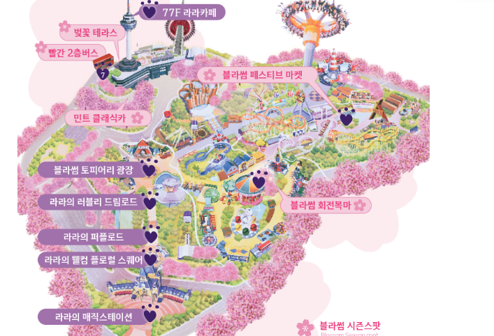 나무들이 이월드 전역을 벚꽃으로 물들여 봄의 정취를 느낄 수 있습니다.