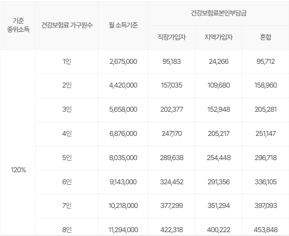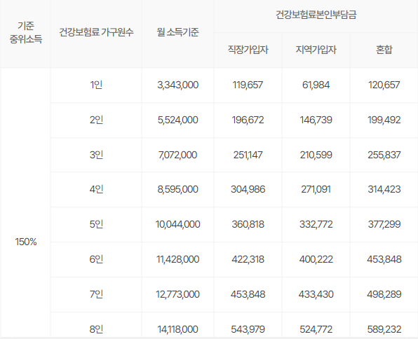 소득요건 : 2024년 2월 건강보험료 기준 2024년 소득기준표