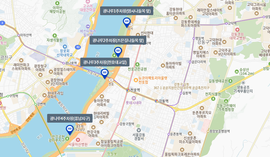 | 광나루3주차장(천호대교밑) | 강동구 풍납동 49-2 | 7,012 | 191 |